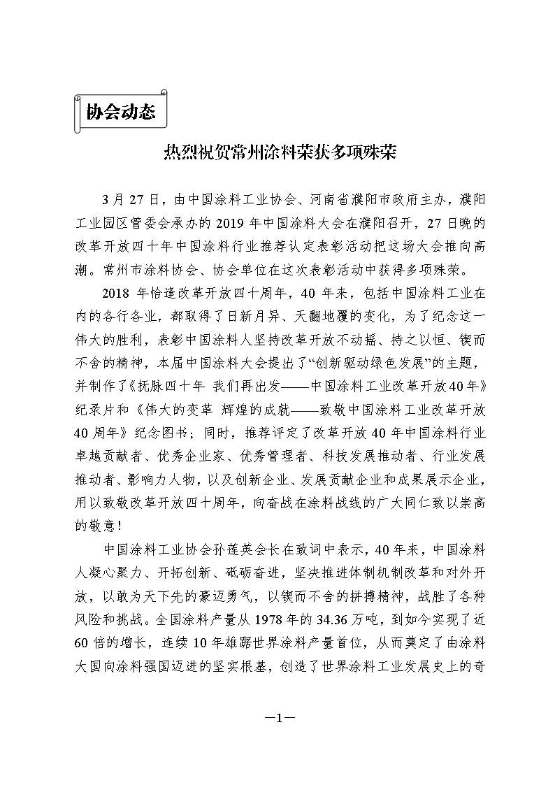 : 常州涂料簡(jiǎn)報(bào)2019年第1期(總第75期)